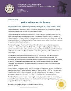 Please see the attached notice to the commercial tenants in Taza about unauthorized Alberta separatist activity on Tsuut’ina Nation lands.