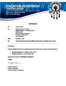 Please see the attached notice regarding Tsuut’ina Education Schools and Offices Closure on November 10th & 11th, 2025.