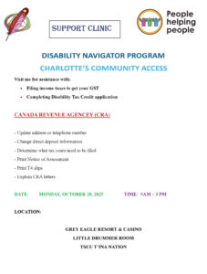 Please see the attached information for the Open Support Clinic with Canada Revenue Agency (CRA) on Monday, October 20th, 2025, from 9 AM – 3 PM at the Grey Eagle Resort & Casino (Little Drummer Room).