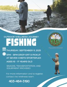 Please see attached poster for the Outdoor Wellness Journey Fishing happening on September 11, 2025 from 5 PM – 7 PM pick-up and drop-off at Seven Chiefs Sportsplex.