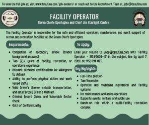 Please see the attached position summary for the Facility Operator at the 7 Chiefs Sportsplex & Chief Jim Starlight Centre.