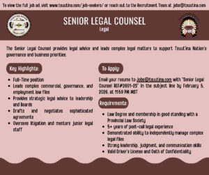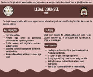 Please see the attached position summary posters on behalf of Tsuut’ina Human Resources.