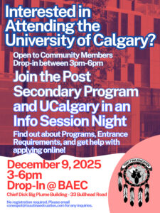 “The TTN Post Secondary Program & University of Calgary is co-hosting an Info Session at the Chief Dick Big Plume Building (BAEC) on Tuesday, December 9th, 2025 from 3pm – 6pm.