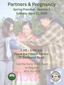 Please see the attached poster for Prenatal Class – Session 1 scheduled for Tuesday, April 21st, 2026, from 1 PM – 3 PM at the Tsuut’ina Health Centre.