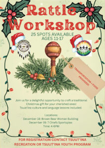 Please see the attached poster for the upcoming Rattle Making Workshop for youth ages 11–17. The Workshop is taking place on December 18th-19th from 4:00 PM to 6:00 PM on both days.