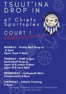 Please see the attached schedule for Recreation Drop-in at the 7 Chiefs Sportplex – Court 1. For more information, contact Recreation at 587-435-9290.