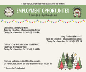 Please see the attached posters highlighting current employment opportunities that are open for applications during the office closure with Tsuut’ina Human Resources. We strongly encourage Nation and Community members to apply if interested. Full position details can be found on the Tsuut’ina Nation website at https://tsuutina.com/job-seekers/