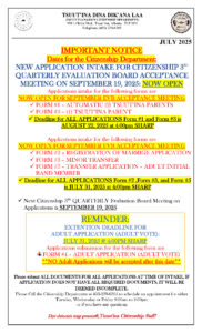 Please see the attached reminder notice for Tsuut’ina Citizenship application dates. For more information or to schedule an appointment, please call the Citizenship Department at 403-238-6305.