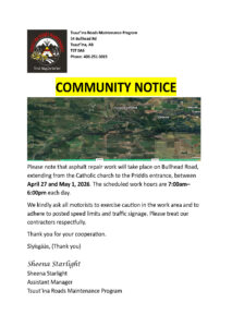 Please be advised that asphalt repair work will take place on Bullhead Road, extending from the Catholic church to the Priddis entrance, between April 27 and May 1, 2026. The scheduled work hours are 7:00am–6:00pm each day. Please see the notice for more information.