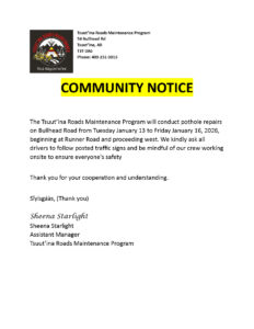 Please be advised that the Roads Department will be conducting pothole repairs on Bullhead Road from Tuesday January 13th to Friday January 16th, 2026. For more information please see the attached.