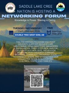 Please see the attached poster for the Network Forum hosted by the Saddle Lake Cree Nation, happening on April 21st & 22nd, 2026, from 9 AM – 3 PM at the Double Tree West Edmonton, AB.