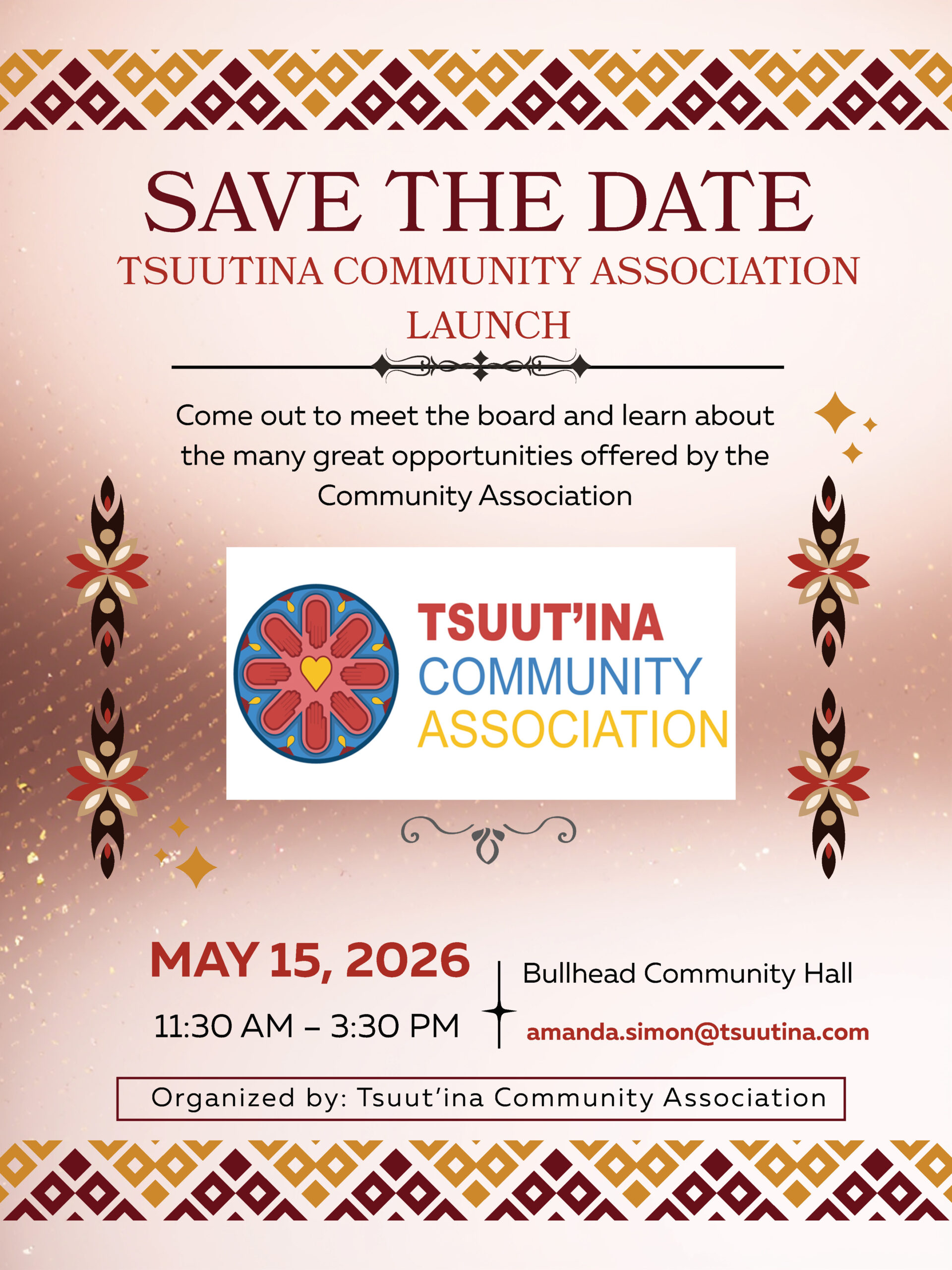 Please save the date for the Tsuut’ina Community Association Launch happening on May 15th, 2026, from 11: 30 AM – 3:30 PM at the Bullhead Community Hall.