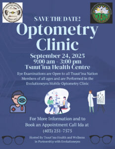 Please save the date for the upcoming Mobile Optometry Clinic on September 24th, 2025, from 9 AM – 3 PM at the Tsuut’ina Health Centre. For More Information and to book an appointment, call Ida at (403) 251-7575.