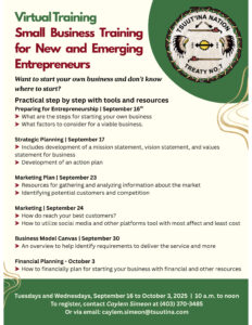 Please be advised that training will be postponed until next Tuesday, September 23, 2025, at 10 AM. The course will take place online. There is still time to register. Please contact the office of the SBI to attend. The training is only available to Tsuut’ina Nation Members and Community Members only. Please call 403.281.4455 Ext 319 or email caylem.simeon@tsuutina.com to register.