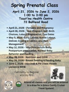Please see the attached poster for Spring Prenatal Classes, starting today, April 21st to June 2nd, 2026, from 1 PM – 3 PM at the Tsuut’ina Health Centre.