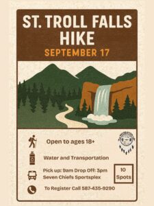 Please see the attached poster for the St. Troll Falls Hike scheduled for September 17th, 2025. To register, call 587-435-9290.
