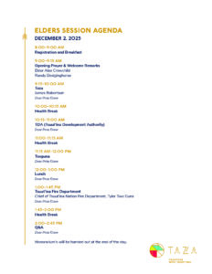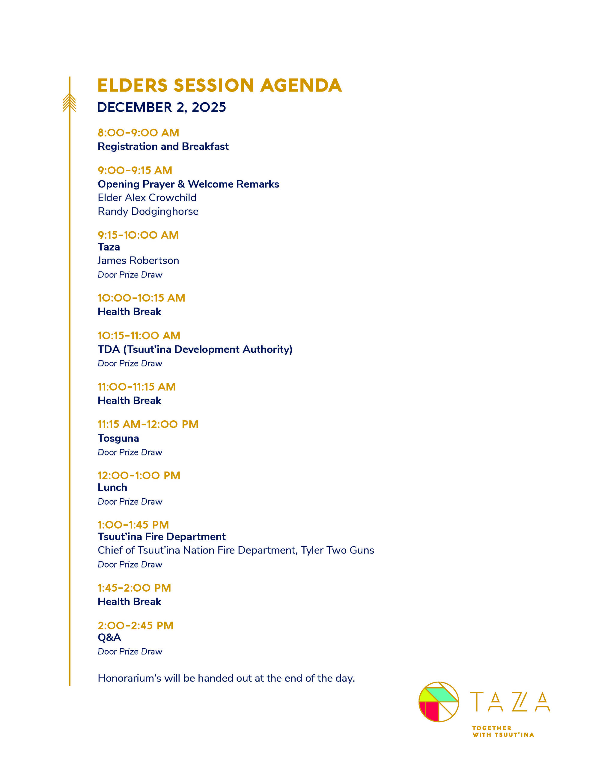Please see the upcoming Taza Information Session for Tsuut’ina Xalikuwa-yina (Tsuut’ina Elders). Happening on December 2nd, 2025, 8 AM – 3:30 PM at Grey Eagle Resort & Casino. Accepting the first 75 Elders who register, each will receive $100 honorarium. This post is a final reminder for registered Elders to confirm their attendance for Tuesday.