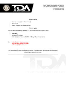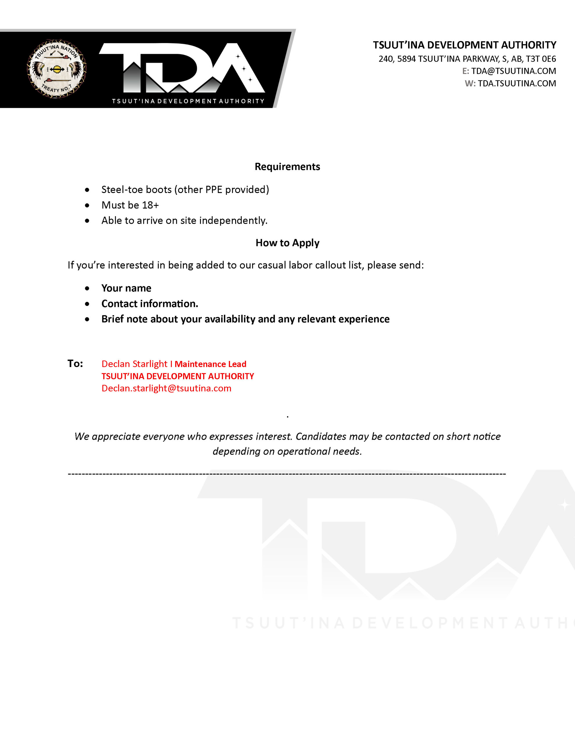Please see the attached Call-out for Landscaping Laborers with Tsuut’ina Development Authority (TDA).