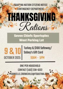 Please see the attached poster for Thanksgiving Rations happening on October 9th & 10th, 2025, from 10 AM – 5 PM at the 7 Chiefs Sportsplex & Chief Jim Starlight Centre (West parking lot). For more information, call (403) 238-6322 or email danielle.crowchild@tsuutina.com