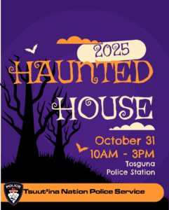 Please see the attached poster for the Tosguna Haunted House happening today, October 31st, 2025, from 10 AM – 3 PM at the Tosguna Police Station.