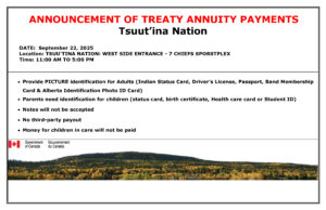 Please see the attached notice for the Treaty Annuity Payment (Note: $5.00, not a PCD) on September 22nd, 2025, from 11 AM – 5 PM at the West Side Entrance – 7 Chiefs Sportsplex & Chief Jim Starlight Centre.