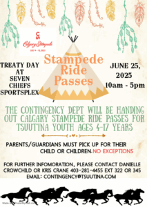 Please see attached for Treaty Day Stampede Ride Passes. Contingency will be handing out Calgary Stampede Passes for Tsuut’ina Youth (ages 4-17 Years) on June 25th, 2025, from 10 AM – 5 PM at the 7 Chiefs Sportsplex & Chief Jim Starlight Centre.