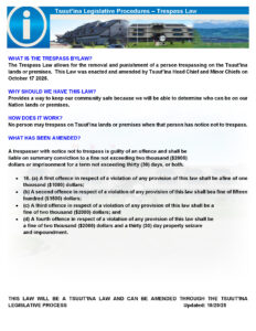Trespass Law amended and ratified as of October 17, 2025. Apologies for the delay as the BCR was being finalized during the elections. Note the document was reviewed and ratified in the 2022/2025 HCMCs last Fall Legislative Assembly. For copies of the Law please reach out to the LPTS Department at lpts@tsuutina.com