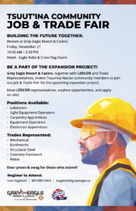 Please see the attached poster for the Tsuut’ina Community Job & Trade Fair happening at Grey Eagle Resort & Casino on Friday, November 21st, 2025, from 10:00 AM – 2:30 PM in the Hotel – Eagle Robe & Crow Flag Room.