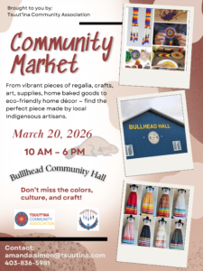 Please see the attached poster and information below for the upcoming Tsuut’ina Community Market happening on March 20th, 2026, from 10 AM – 6 PM at the Bullhead Community Hall.