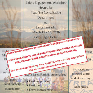 Please see the attached poster for the upcoming Elders Engagement brought to you by Tsuut’ina Consultation Department and the Lands Portfolio. The Elders engagement will be happening at the Grey Eagle Hotel on March 11th-12th, 2026 from 8am-3pm.
