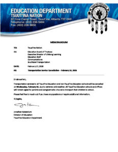 “Transportation services to all Tsuut’ina Education and Non-Tsuut’ina Education schools will be cancelled on Wednesday, February 18, due to extreme cold weather. All Tsuut’ina Education schools and offices will remain open for parents and caregivers who choose to transport their children to school.”