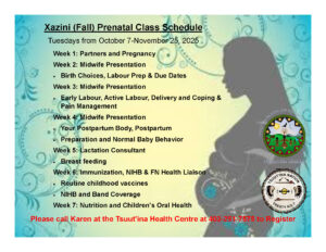 Please see the attached schedule for the Fall Prenatal Classes starting on Tuesday, October 7th – November 25th, 2025. To register, call Karen at the Tsuut’ina Health Centre at 403-251-7575.