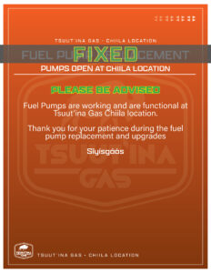 Please be advised that the Fuel Pumps are working and are functional at the Tsuut’ina Gas Chiila Location.