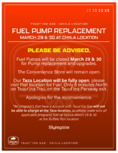 Please be advised that the fuel pumps will be closed on March 29th & 30th, 2026, for pump replacement and upgrades at the Tsuut’ina Gas Stop – Chiila Blvd location.