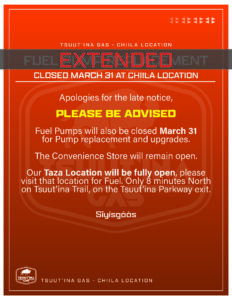 Please be advised that the fuel pumps will also be closed on March 31st, 2026, for pump replacement and upgrades at the Chiila location. The convenience store will remain open, and fuel can still be purchased at the Taza location north of Tsuut’ina Trail.