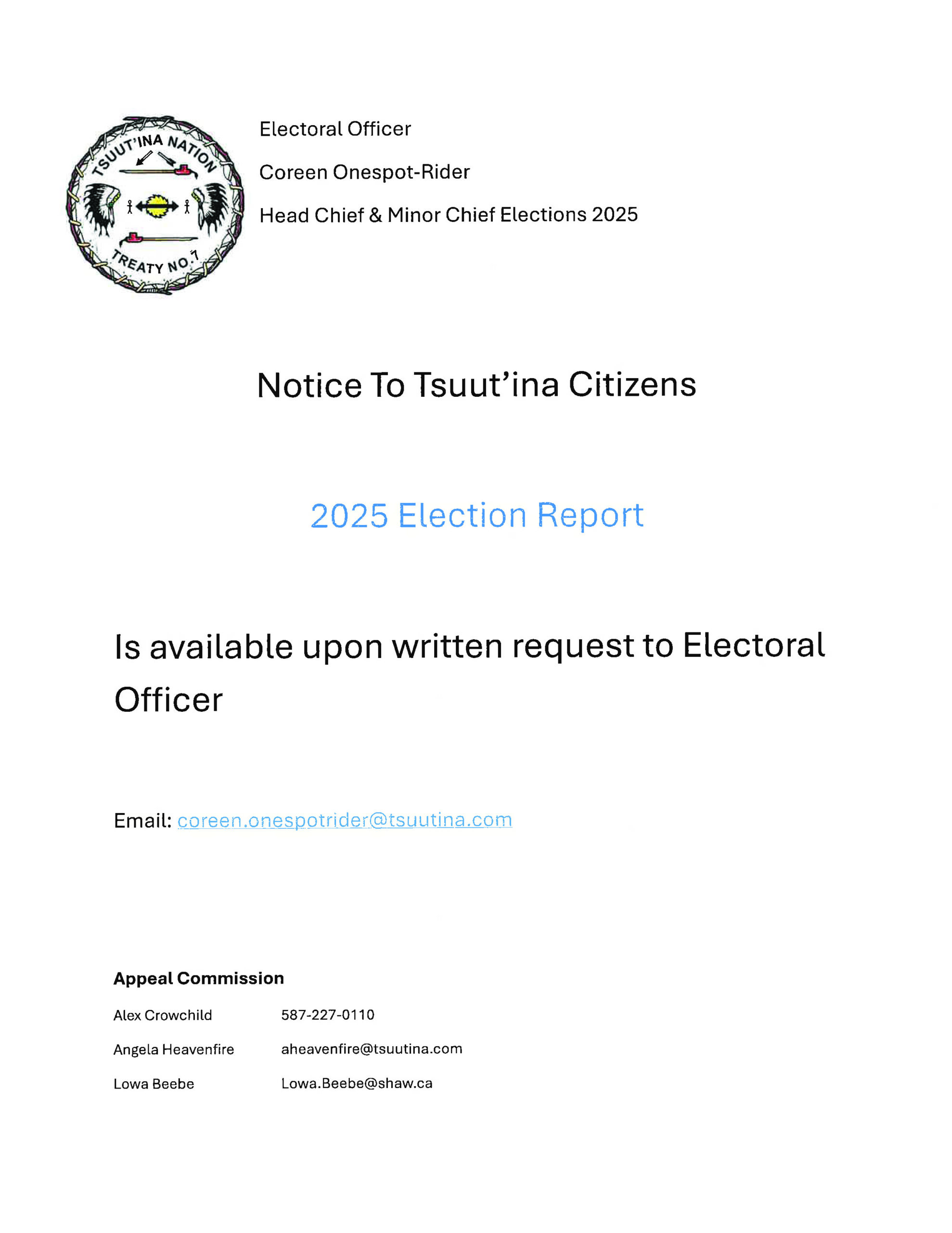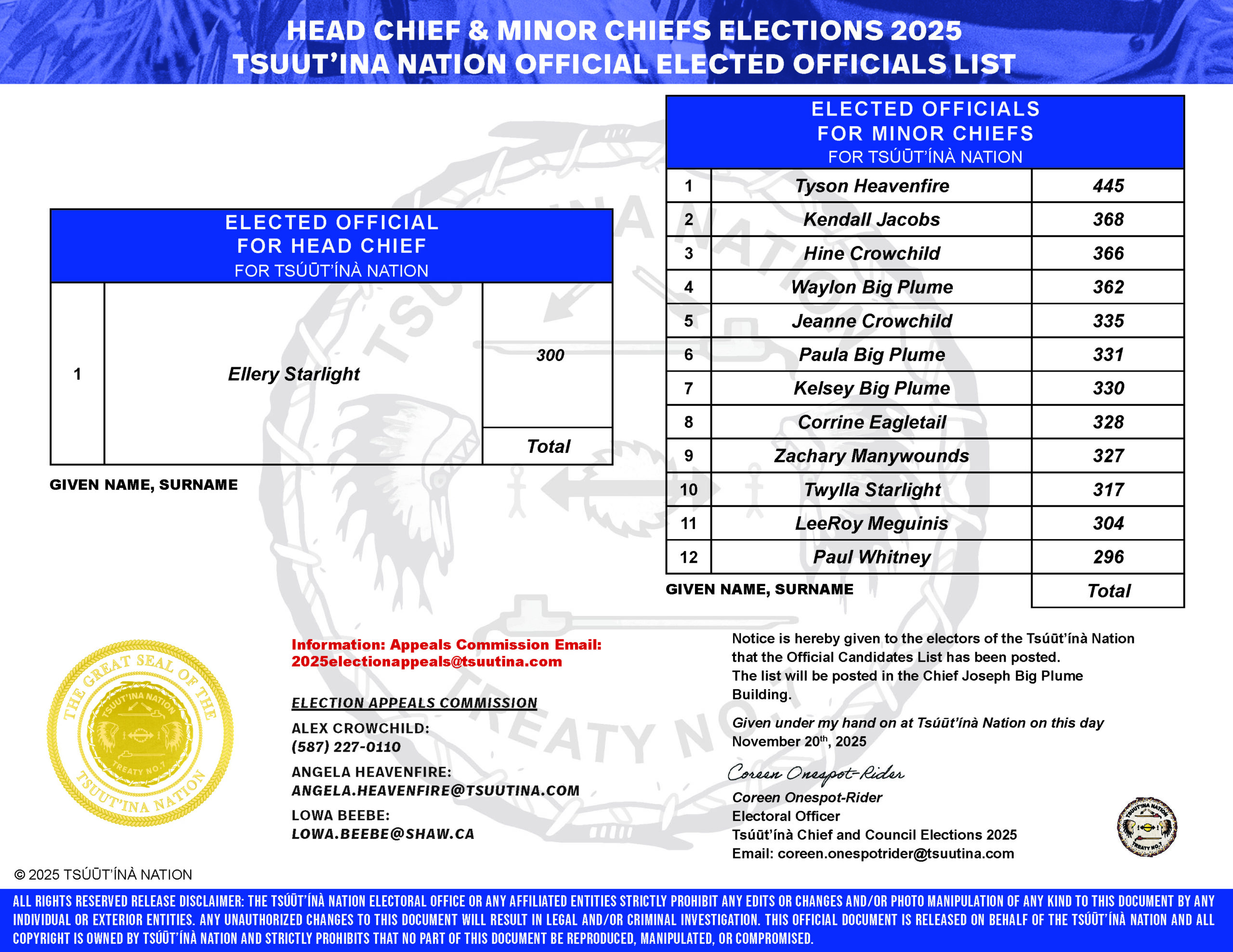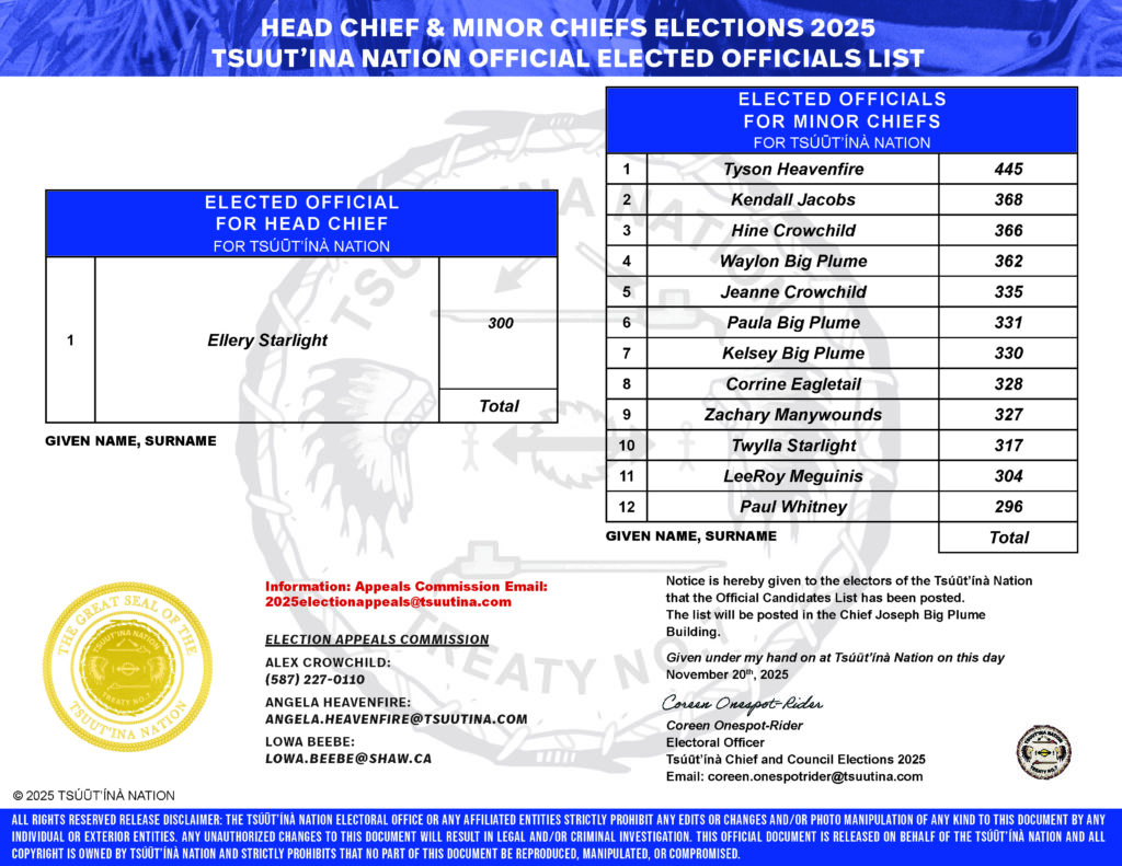 Here are the elected officials for the Tsuut’ina Nation Head Chief and Minor Chiefs 2025 – 2028.