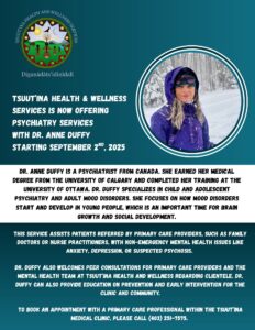 Please see the attached information on behalf of the Tsuut’ina Health and Wellness Services for Psychiatric Services starting September 2nd, 2025.