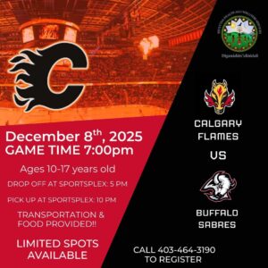 The Tsuut’ina Health & Wellness Team is excited to take our youth to the Calgary Flames game this Monday, December 8th as they face the Buffalo Sabres!