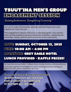 Please see the attached poster for the Tsuut’ina Men’s Group Engagement Session taking place on Sunday, October 12, 2025, from 10 AM – 4 PM at the Grey Eagle Hotel (lunch provided and raffle prizes!).