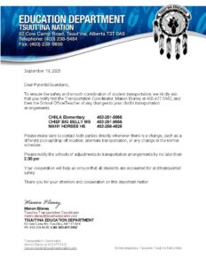 Please see attached letter from the Tsuut’ina Education Department about student transportation.