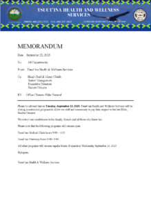 Please be advised that the Tsuut’ina Health and Wellness Services will be closing nonessential programs on Tuesday, September 23, 2025, to allow staff and community to pay their respect to the late Elder, Sandra Onespot.