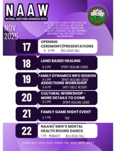 Please see the attached poster and information for the Tsuut’ina Health and Wellness’ Event schedule for 2025 National Addictions Awareness Week (NAAW).