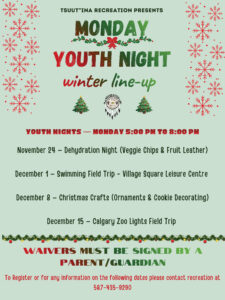 Please see the attached posters for the Tsuut’ina Recreation Youth Night Winter Line Up starting November 24th – December 15th, 2025 (every Monday) from 5 PM – 8 PM.