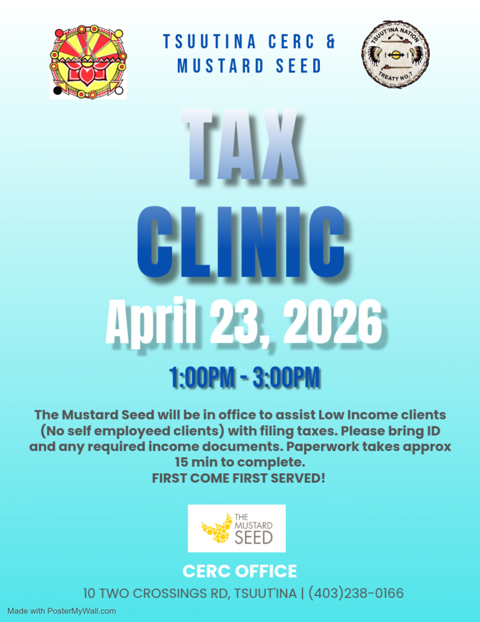 April 23 @ 1:00 pm - 3:00 pm Tax Clinic – Tsuut’ina CERC & Mustard Seed CERC Office 10 Two Crossings Road