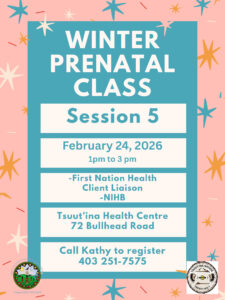 Please see the attached poster for the upcoming prenatal session 5 on Tuesday, February 24th, 2026, from 1:00 PM to 3:00 PM at the Tsuut’ina Health Centre.