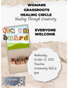 Please see the attached poster for the Women’s Grassroots Healing Circle taking place on Wednesday, October 22nd, 2025, from 6 PM at the Bullhead Community Hall.